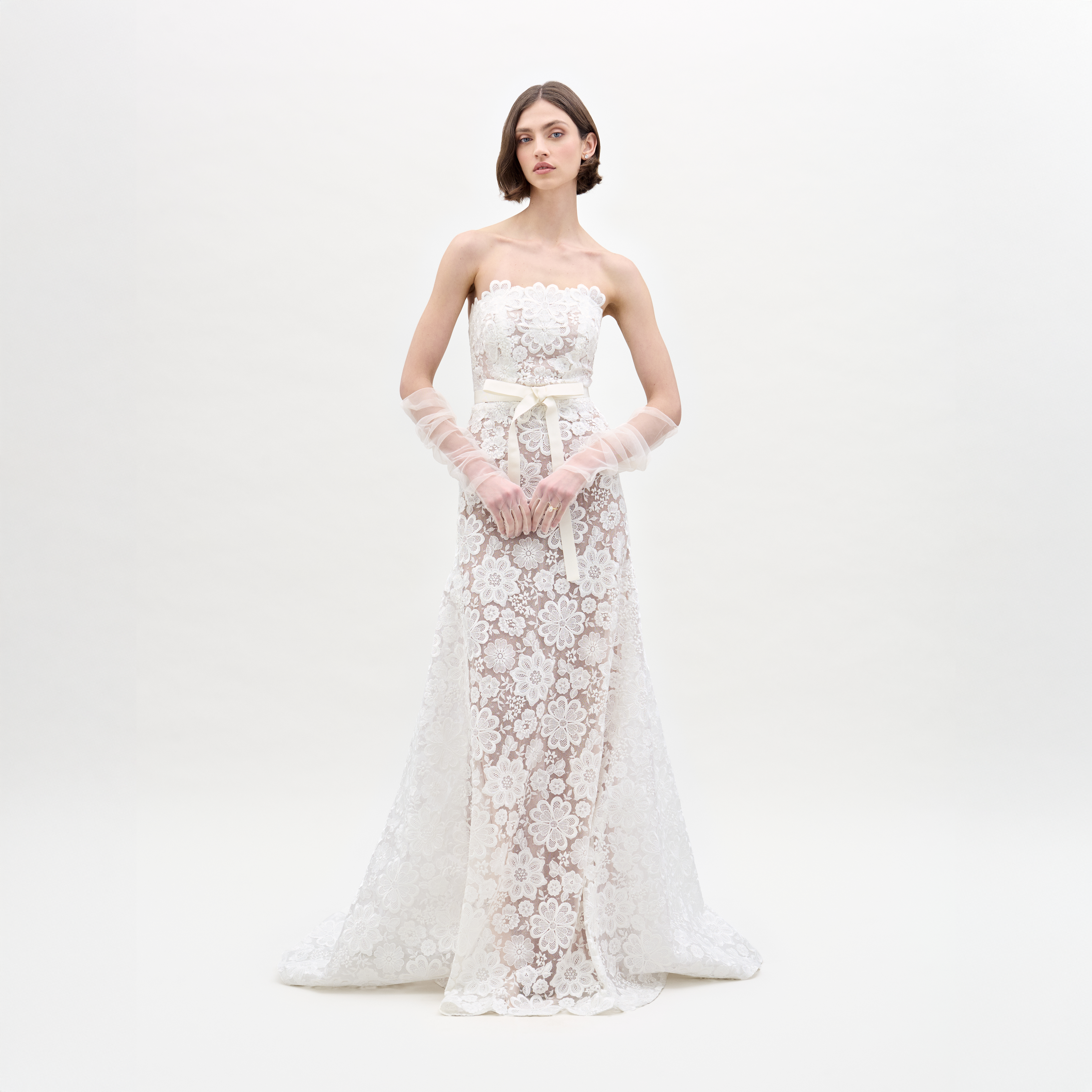 - Floor-length skirt with train
